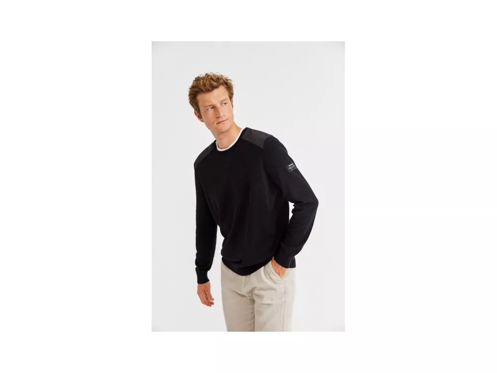 Elegantný pánsky sveter Ecoalf v čiernej farbe. Materiál je kombináciou organickej bavlny a kašmíru. Je príjemne mäkká a pohodlná na dotyk. Celkový vzhľad dopĺňajú detaily v podobe kontrastného prešitia na ramenách a loga na rukáve.
