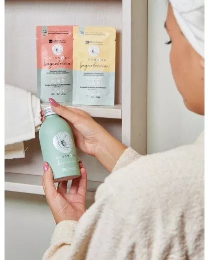 - Do vody nasypte celý obsah vrecka práškovej kozmetiky, napríklad energizujúceho alebo vyživujúceho sprchového gélu od laSaponaria.