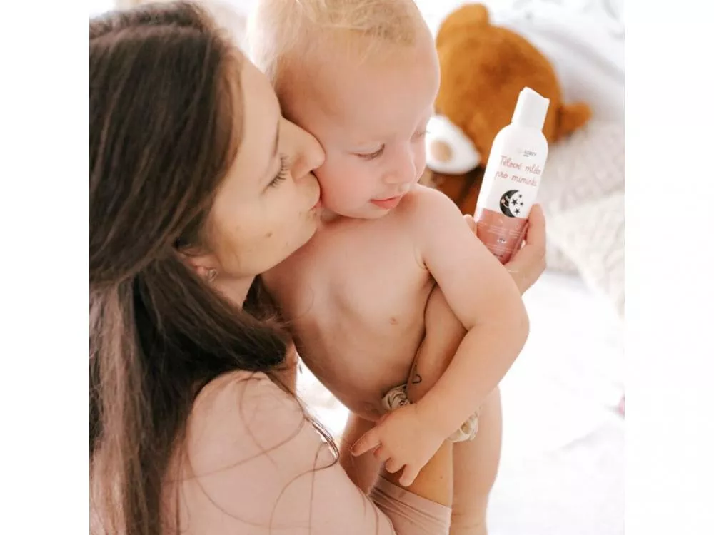 Prírodné zloženie telového mlieka pre bábätká je vhodné pre citlivú pokožku detí už od narodenia.